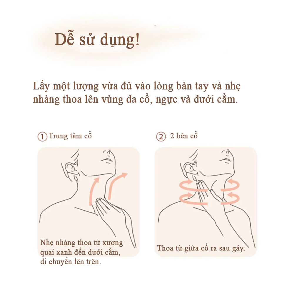 - Thoa một lượng vừa đủ kem lên vùng cổ sạch, massage nhẹ nhàng theo hướng từ dưới lên trên để dưỡng chất thẩm thấu đều.
