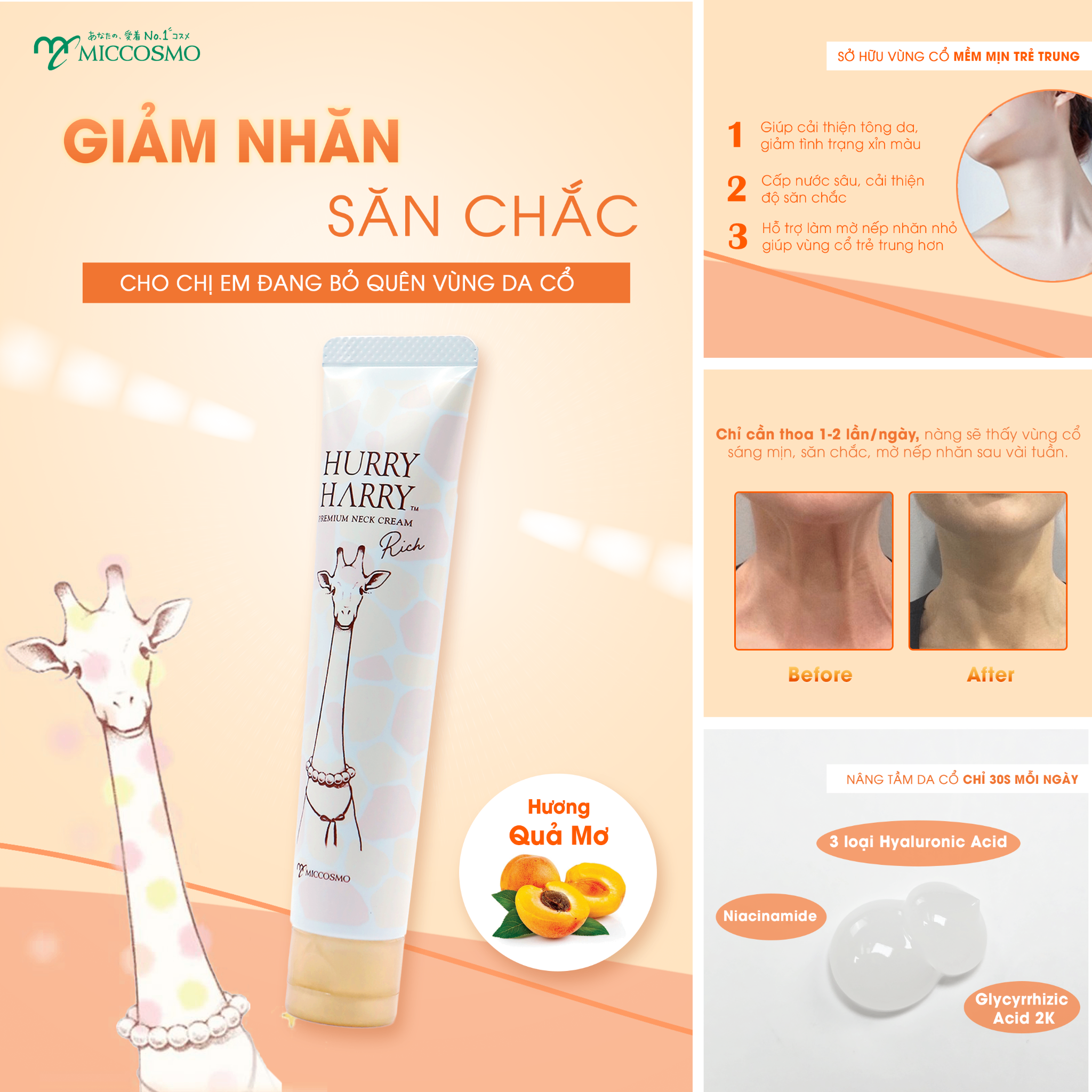 Miccosmo Hurry Harry Premium Neck Cream Rich là kem dưỡng cổ chuyên biệt hỗ trợ ngăn ngừa nếp nhăn, làm sáng và phục hồi vùng da cổ, cho làn da mịn màng và săn chắc trẻ trung.