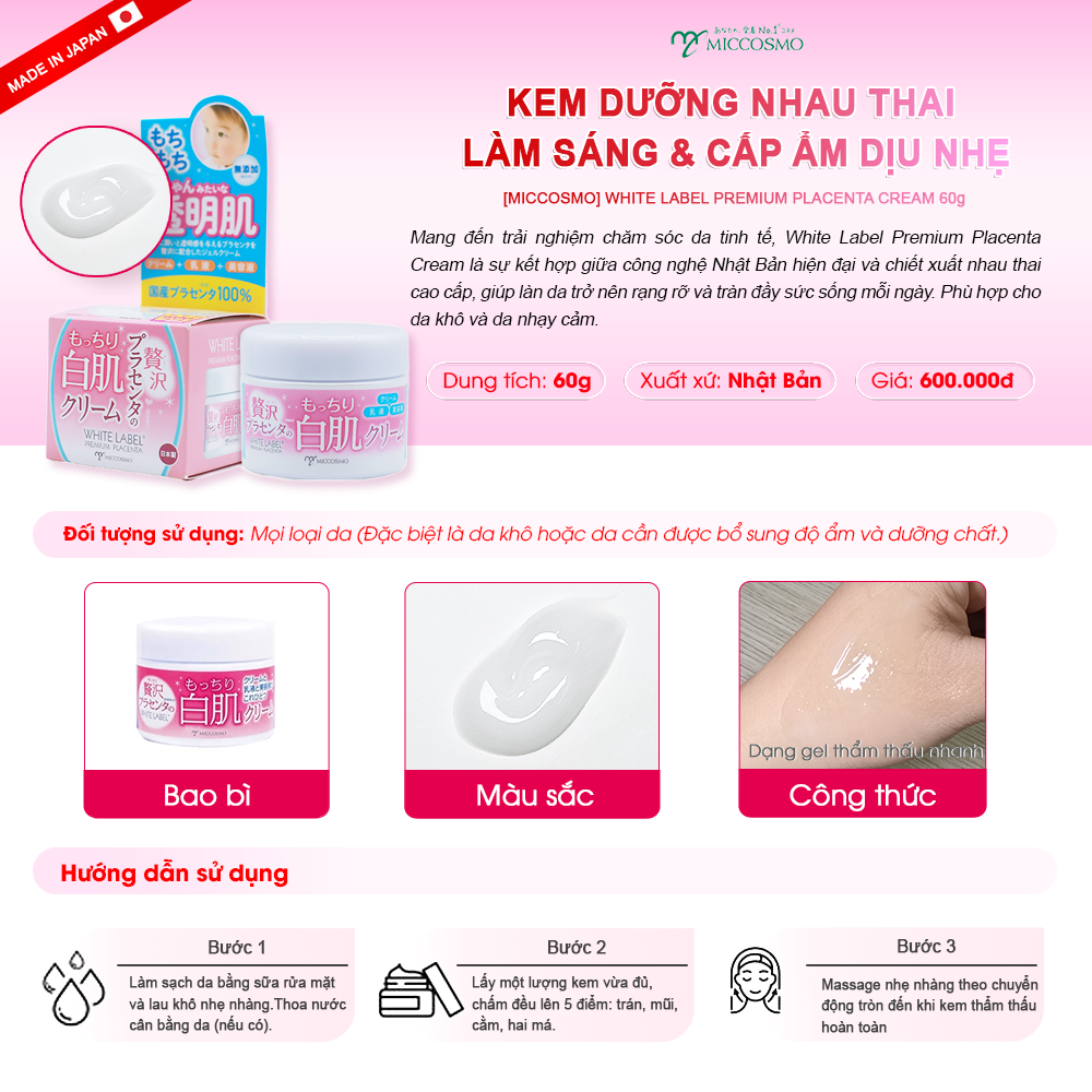 MICCOSMO WHITE LABEL PREMIUM PLACENTA CREAM 60g – KEM DƯỠNG CẤP ẨM, HỖ TRỢ DƯỠNG SÁNG