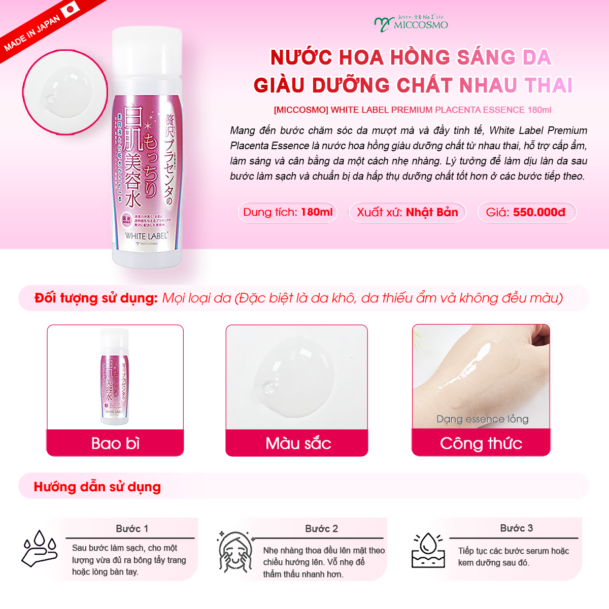 Miccosmo White Label Premium Placenta Essence là nước hoa hồng nhau thai trứ danh từ Nhật Bản giúp hỗ trợ ngừa lão hóa, làm dịu và phục hồi làn da khô xỉn mang lại bề mặt da mềm mượt, tươi sáng và căng khỏe.